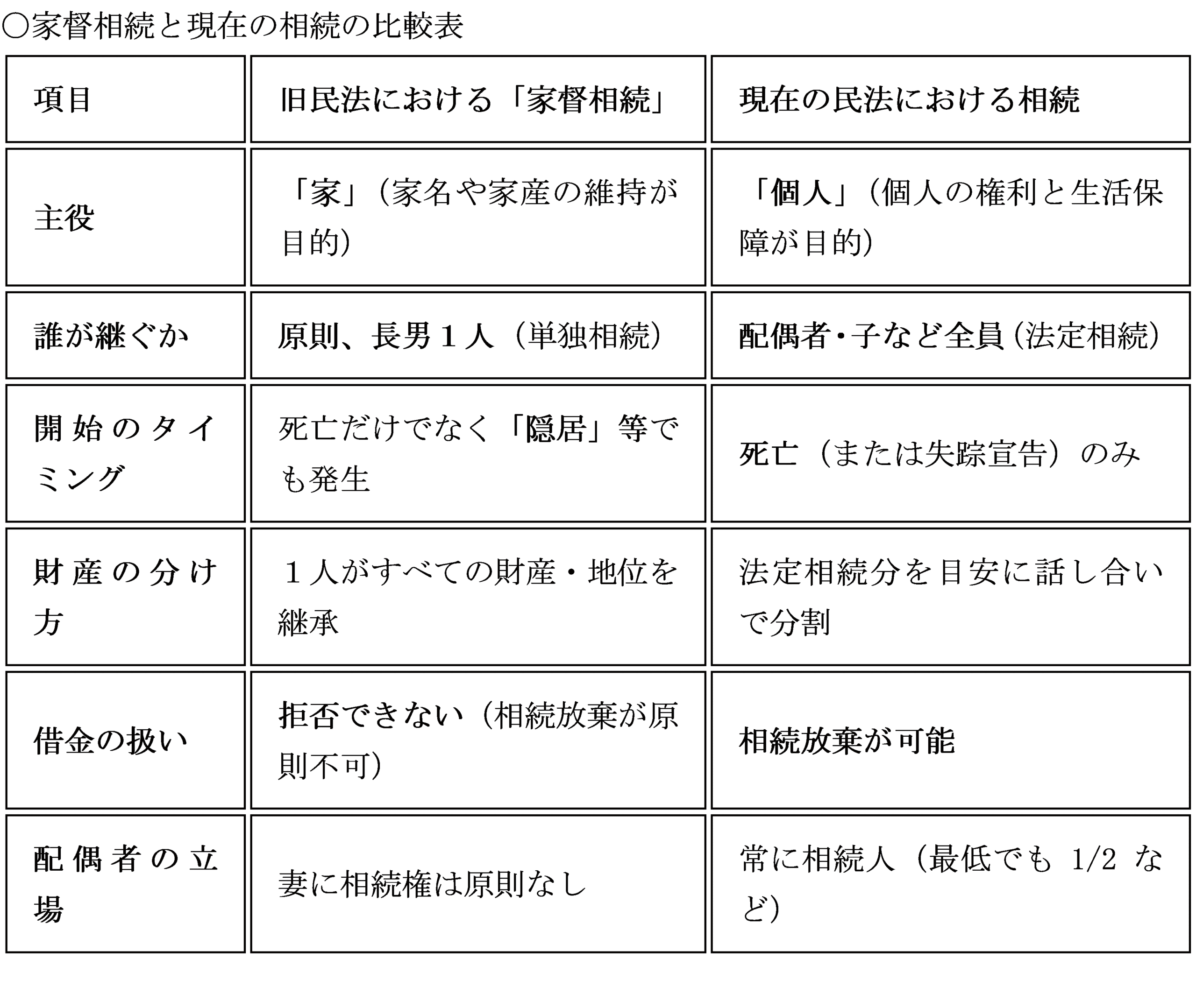 一言でいうと、旧民法における家督相続は「『家』という組織を維持するために、リーダー一人に全てを集中させる制度」であり、現在の民法における相続は「個人の財産を、家族で公平に分け合う制度」です。主な違いをわかりやすく比較表にまとめました。